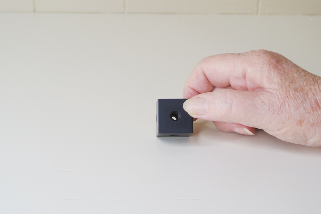 The Newport CC-1 Construction Cube is made such that it presents six orthogonal faces, being a cube. Four of the faces have one 1/4-20 tapped hole in the center of each face. The remaining two faces of the cube have respectively one clearance hole for a quarter-20 screw and opposite that, one hole counterbored to accept the head of a quarter-20 cap screw. Thus, a 1/4-20 socket head cap screw can be inserted through the cube allowing the user to attach the cube to another external surface.
