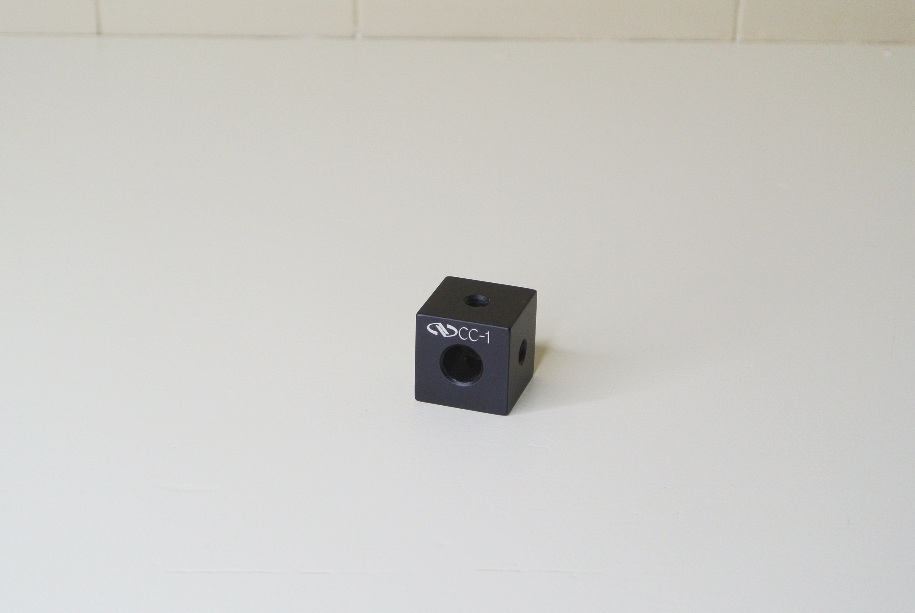The Newport CC-1 Construction Cube is made such that it presents six orthogonal faces, being a cube. Four of the faces have one 1/4-20 tapped hole in the center of each face. The remaining two faces of the cube have respectively one clearance hole for a quarter-20 screw and opposite that, one hole counterbored to accept the head of a quarter-20 cap screw. Thus, a 1/4-20 socket head cap screw can be inserted through the cube allowing the user to attach the cube to another external surface.