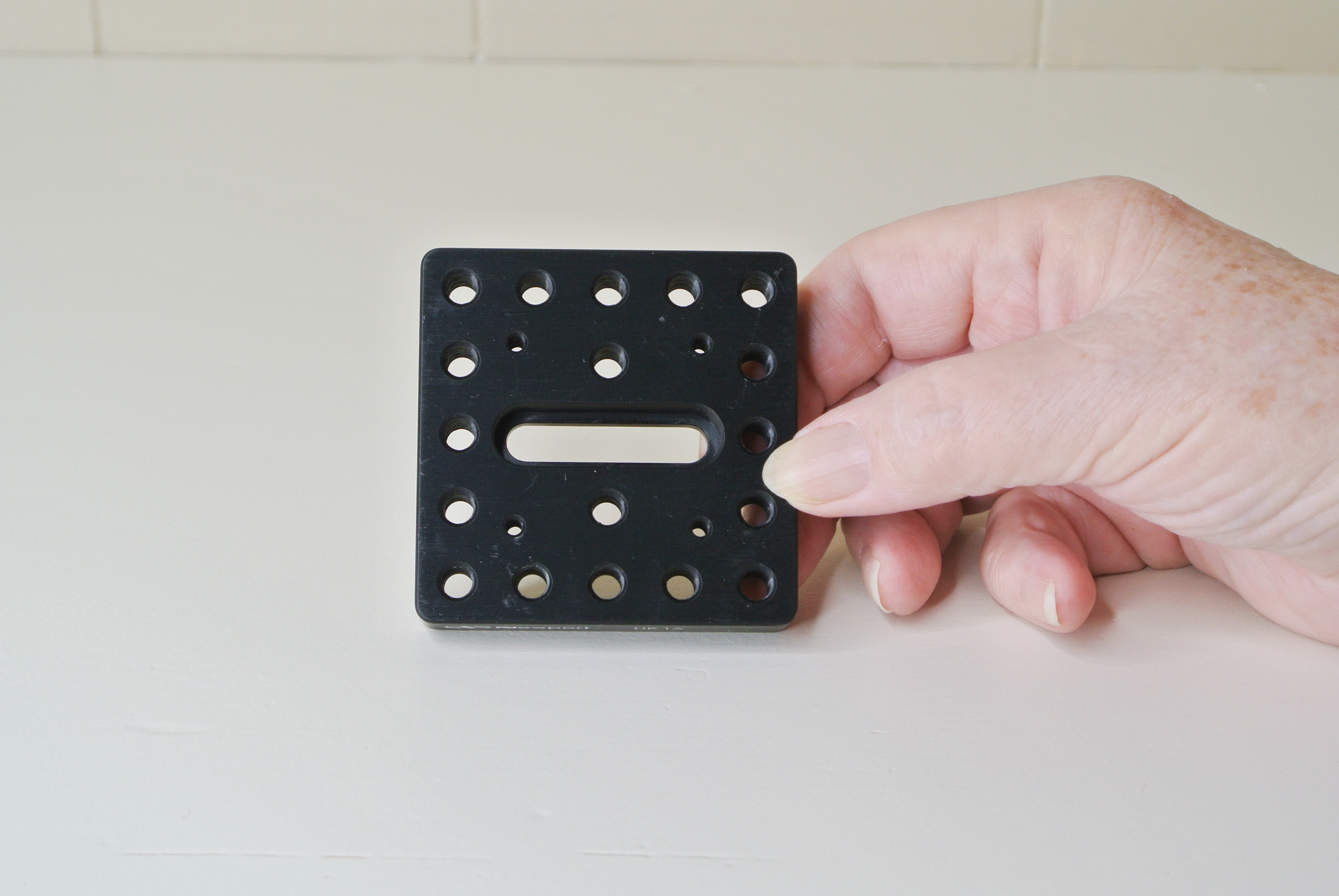 It is 2.56″ by 2.56″ and it is about 7/16″ thick. It has an array of 18 through holes tapped with 1/4-20 threads, and 4 holes with #6-32 threads. It also has a central slot which is counterbored, to accept a quarter-20 screw and will clear the head of a socket head cap screw. We will discuss that slot in just a bit.