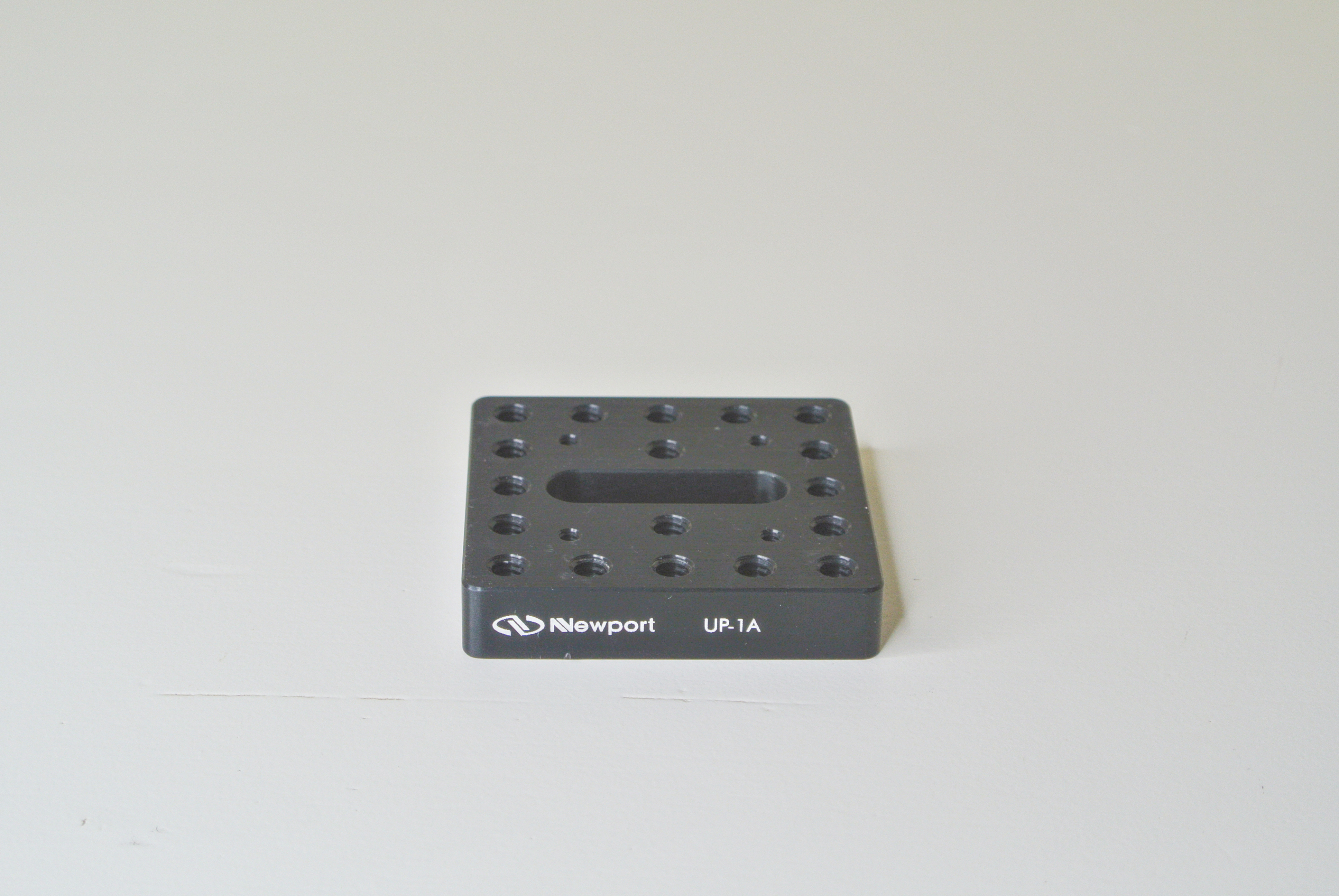 Newport’s model UP-1A Universal Baseplate is a helpful part to have in your opto-mechanical bag of tricks. This item is a small square machined aluminum plate with multiple tapped holes and a slot which is located in the center. It is normally supplied with a matte black surface finish.